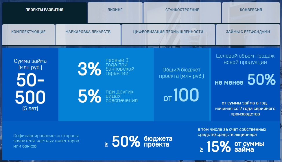 В рамках этой программы льготное заёмное софинансирование предоставляется на проекты, направленные на импортозамещение и производство конкурентоспособной продукции гражданского назначения.